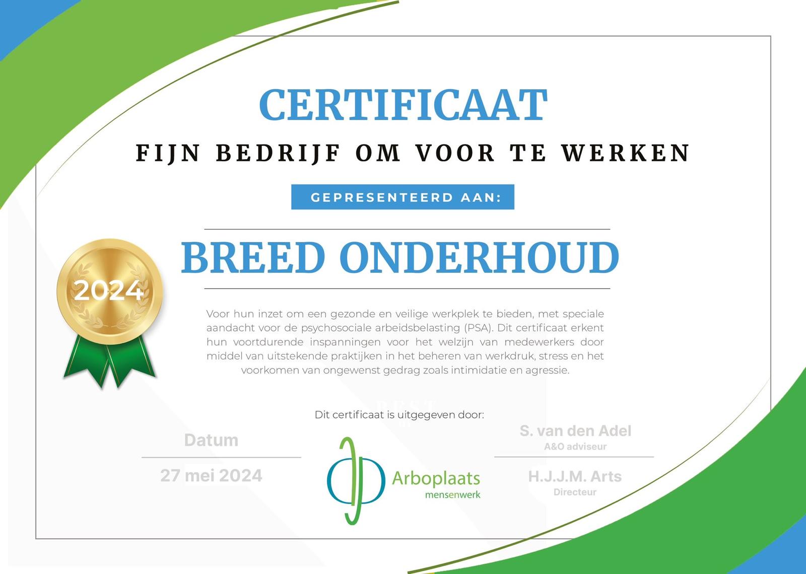 Via Koninklijke OnderhoudNL zijn wij in contact gekomen met Arboplaats BV om Breed Onderhoud te ondersteunen met het vernieuwen van onze RI&E en om onder onze mederwerkers en Co-makers een Psychosociale Arbeidsbelasting Onderzoek (PSA) uit te voeren. Uit dit onderzoek van 163 pagina's groot is gebleken dat de ondervraagden over het algemeen heel positief zijn over onze organisatie. Ruim 70% geeft een 8 of hoger, 54% geeft werkgeluk ook een 8 of hoger en privé is dat zelfs bijna 80%.